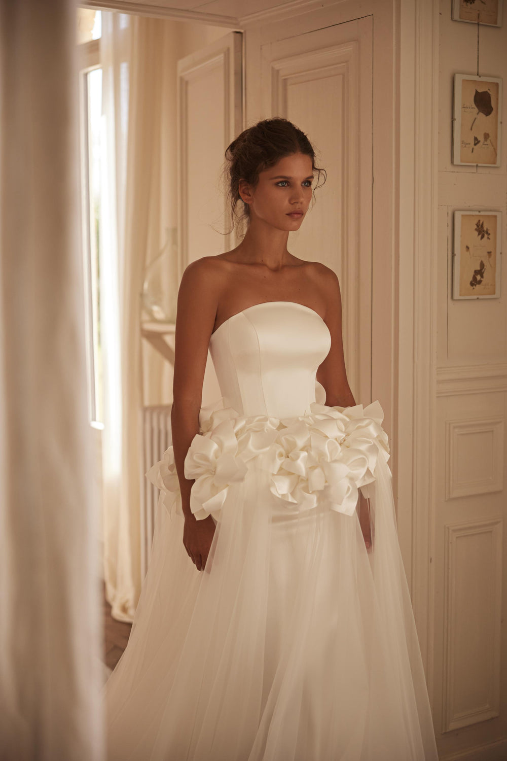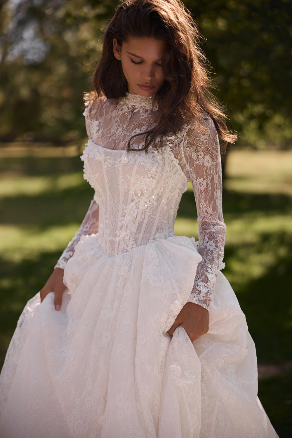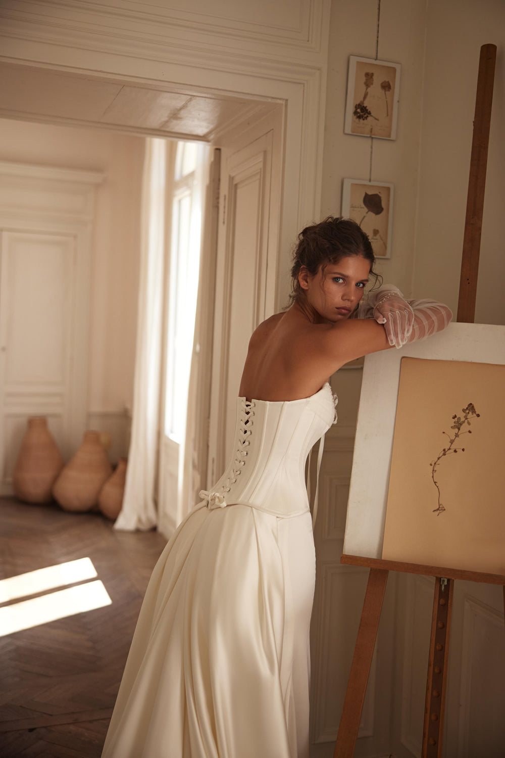Esta colección te transporta a Normandía, la tierra donde los impresionistas capturaban con pasión la luz en sus lienzos, respiraban la embriagadora fragancia de los manzanos y escuchaban el murmullo del mar. Bohemios y románticos, los vestidos encarnan la misma magia: las telas fluyen como suaves olas, el encaje recuerda a jardines en flor y los detalles brillantes reflejan la luz única de Normandía.