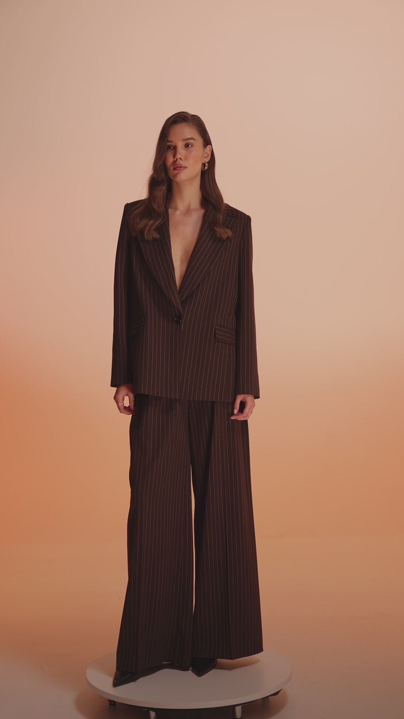 El blazer de corte recto con hombros estructurados crea una silueta impecable, resaltando la confianza y el buen gusto de quien lo luce. Los pantalones de pierna ancha aportan ligereza y elegancia natural, manteniendo una estructura perfecta. Confeccionado en un tejido único con una fina raya diplomática, alarga visualmente la figura y aporta una sofisticación discreta.