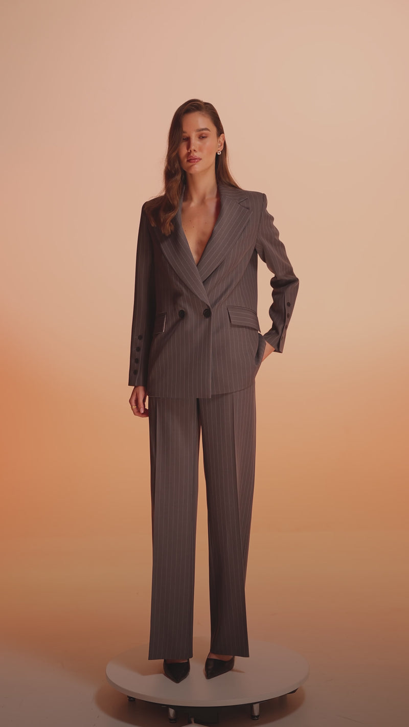 Este refinado traje de la colección premium combina la estética clásica con la elegancia moderna. El blazer cruzado alargado con solapas estructuradas acentúa la silueta y aporta seguridad al look. Los pantalones rectos alargan visualmente las piernas, creando una apariencia equilibrada y elegante. Confeccionado con un tejido único de alta calidad y una fina raya diplomática, ofrece sofisticación y prestigio.