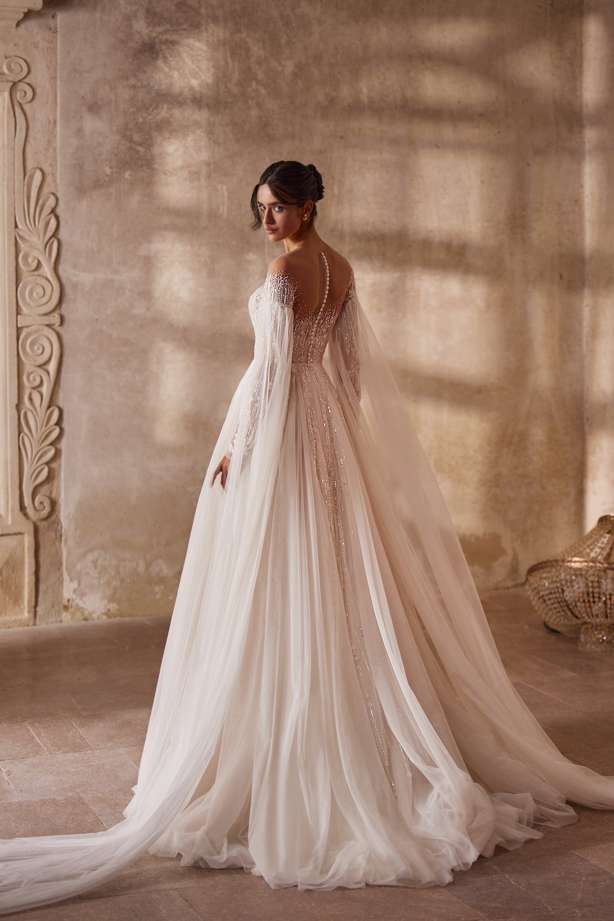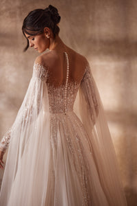 El bolero color carne y manga larga con encaje adorna en la parte superior del corsé. El bolero y las mangas se abrochan con botones. La falda tiene cuñas de tul de seda. El vestido está decorado con encaje de pedrería y bordados hechos a mano de perlas, cristales y lentejuelas de diferentes tamaños. Adorna al diseño un cinturón bordado a lo largo de la línea de la cintura.