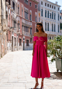 Vestido para eventos de corte clásico A con escote bardot y largo midi. Confeccionado en raso y adornado con tirantes de strass sobre las líneas del busto creando una imagen de doble tirante.