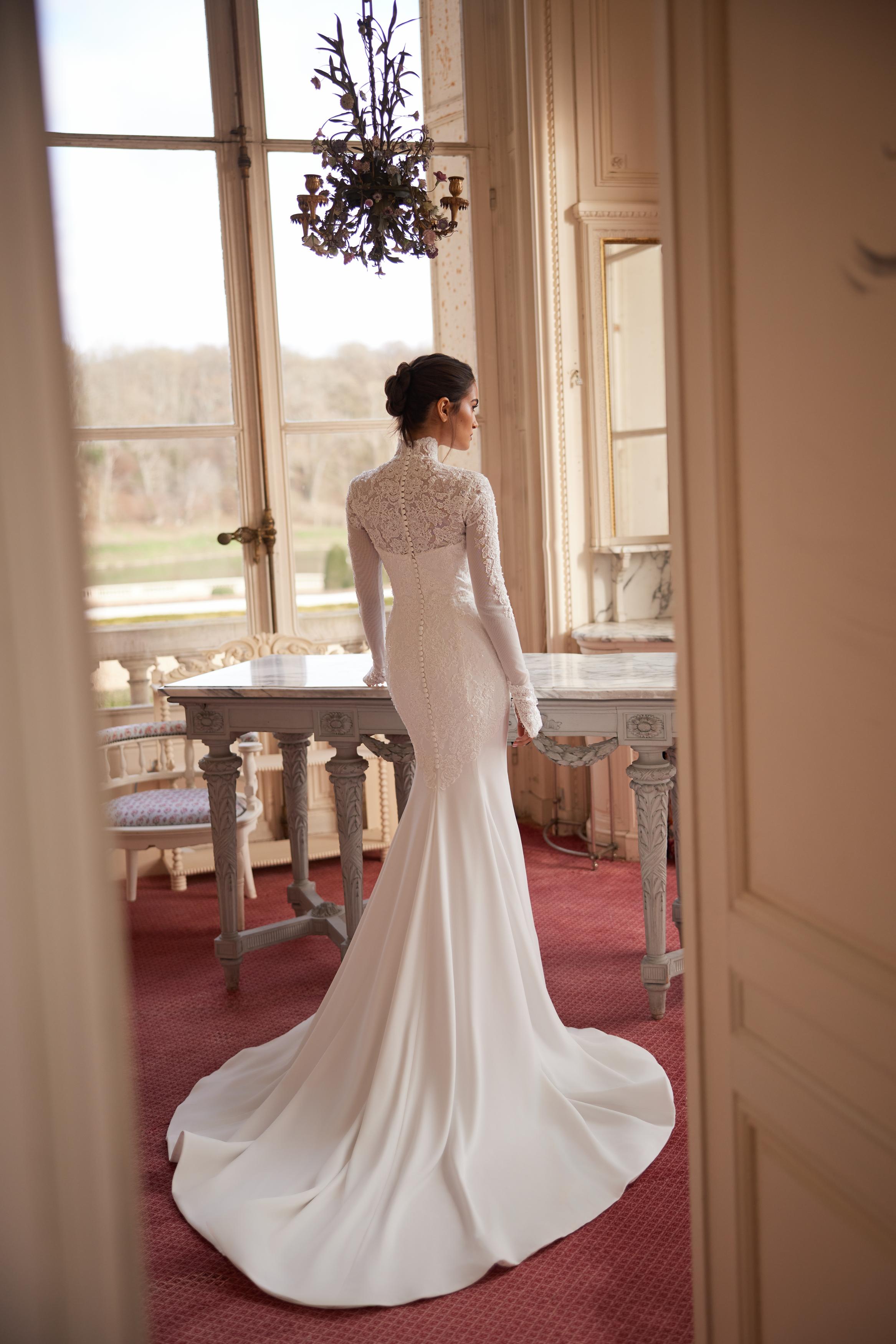 La falda, ajustada y fluida, se prolonga en una larga cola que acompaña el movimiento con una elegancia serena, mientras que el diseño puede transformarse mediante un elemento desmontable de tul y encaje que añade volumen y dramatismo de forma sutil.