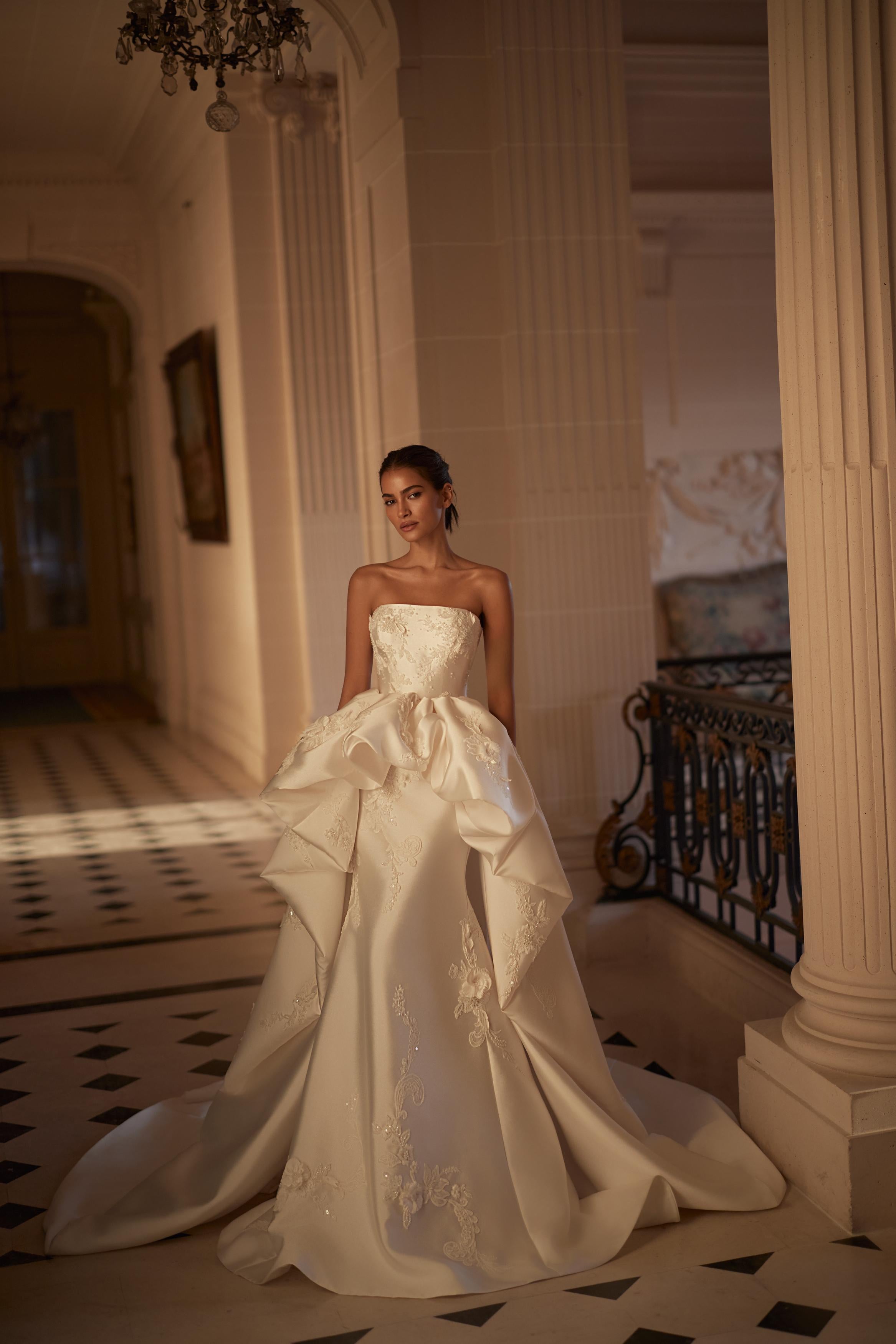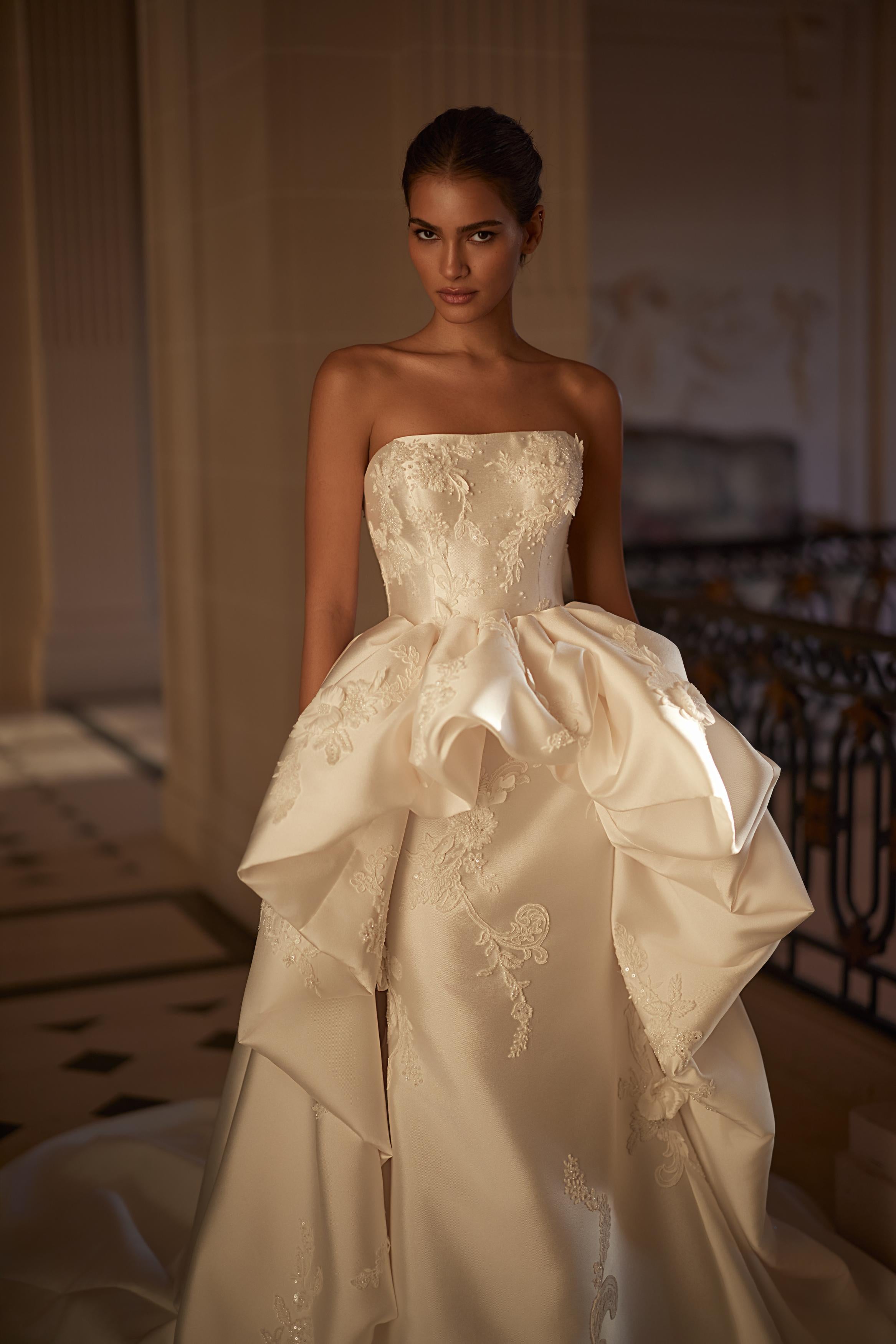 Confeccionado en Mikado en tono marfil, el diseño se define por su presencia arquitectónica y su caída impecable. El cuerpo, de hombros descubiertos y escote recto, dibuja una línea pura y elegante que sirve como lienzo para un trabajo ornamental extraordinario.