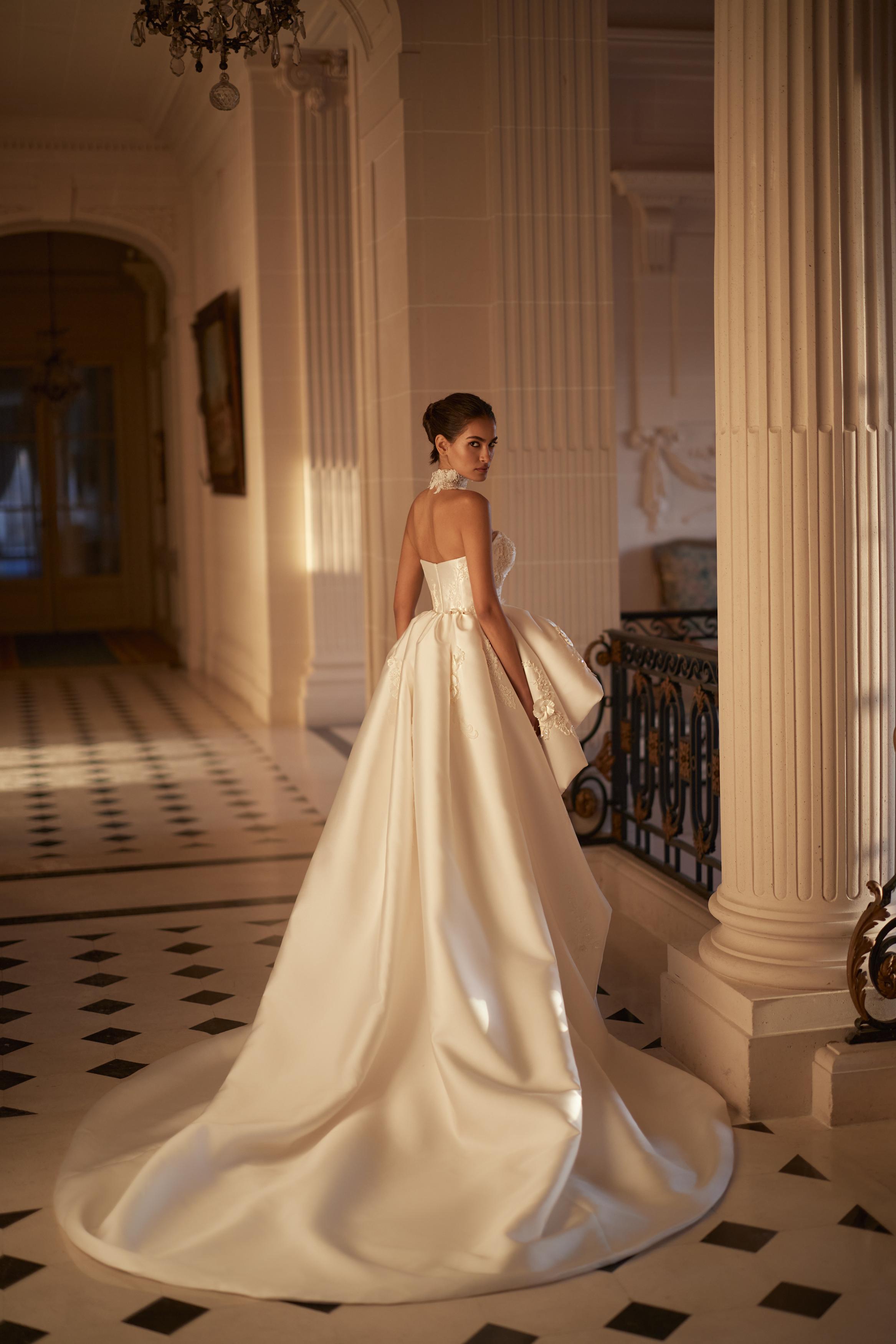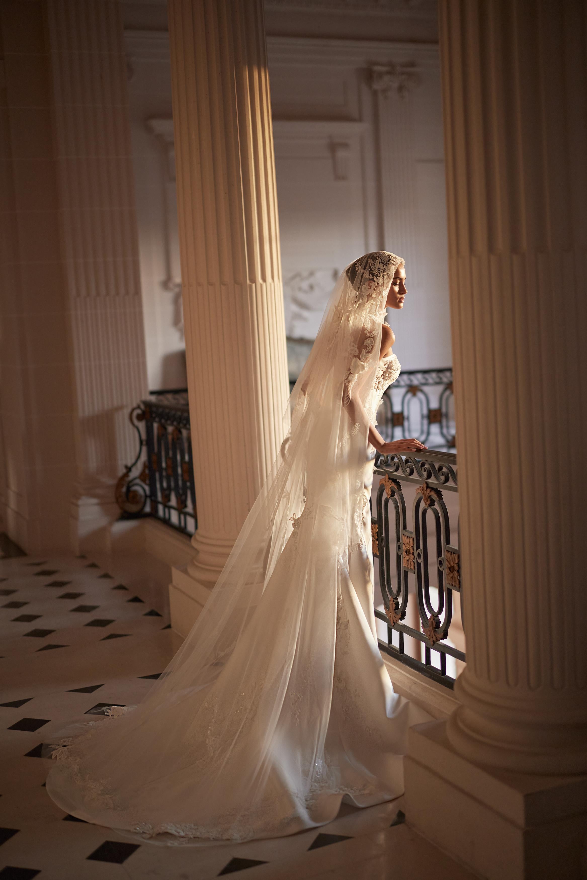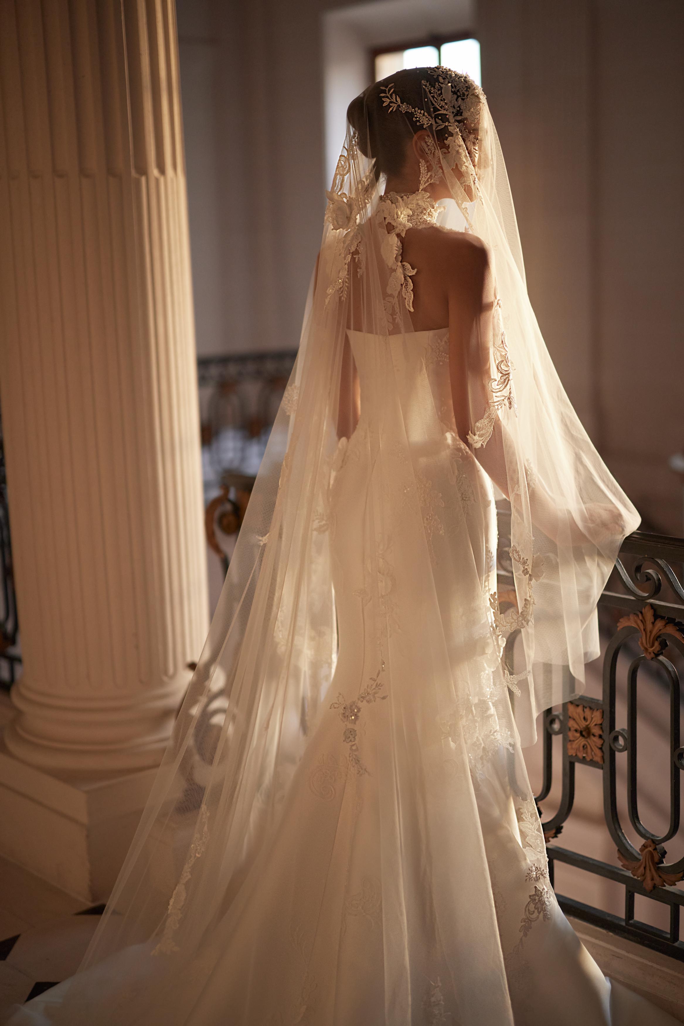 Rayssa revela su dimensión más versátil a través de sus elementos transformables. Una sobrefalda asimétrica de gran volumen, adornada con encaje, añade dramatismo y movimiento. El velo de tul con insertos de encaje introduce un matiz etéreo, mientras que la gargantilla asimétrica bordada aporta un gesto contemporáneo y distintivo.