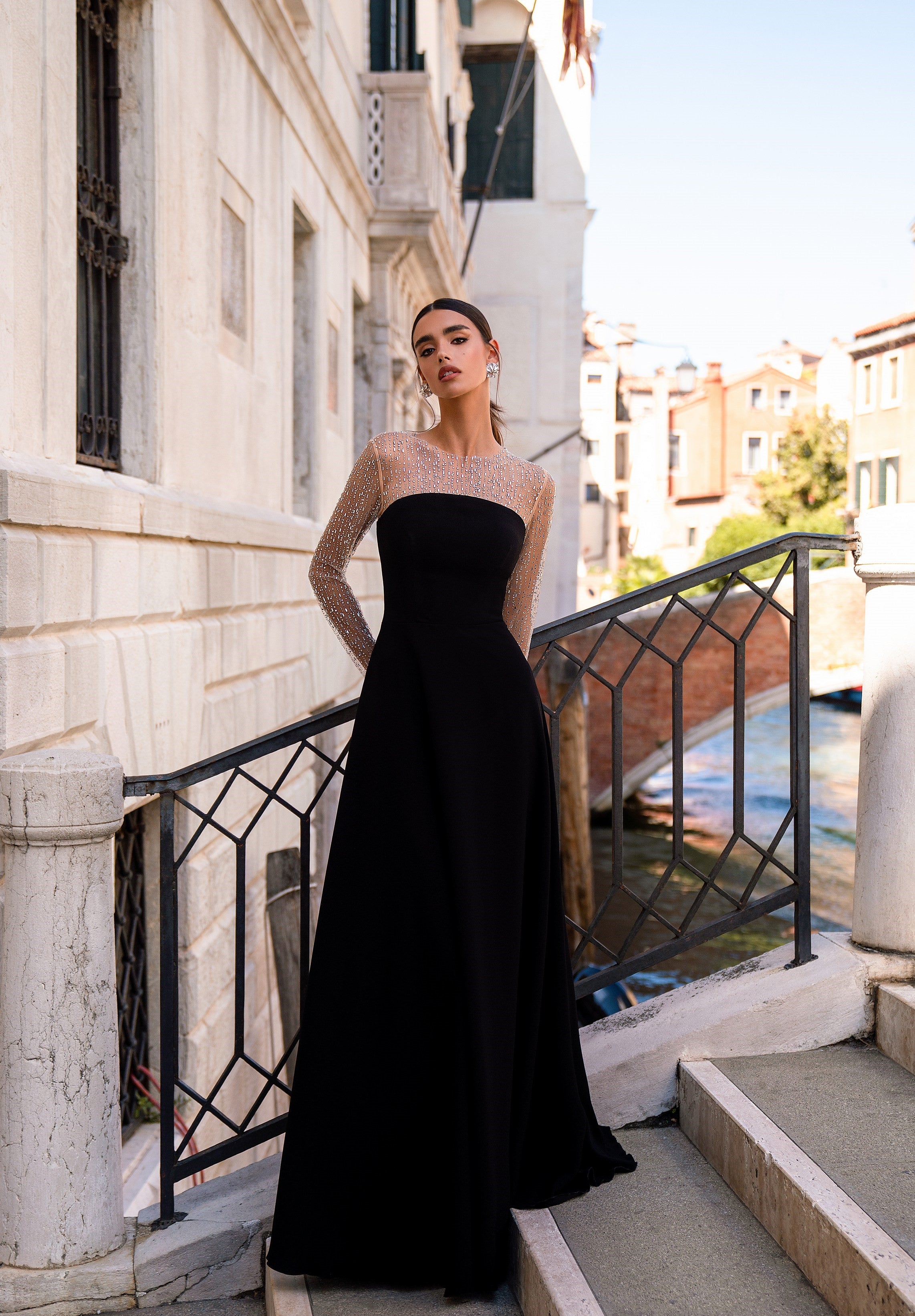 A-line dress for evening events with long sleeves and a fantasy neckline made of shiny beaded tulle. It closes in the back with a row of crepe-covered buttons.