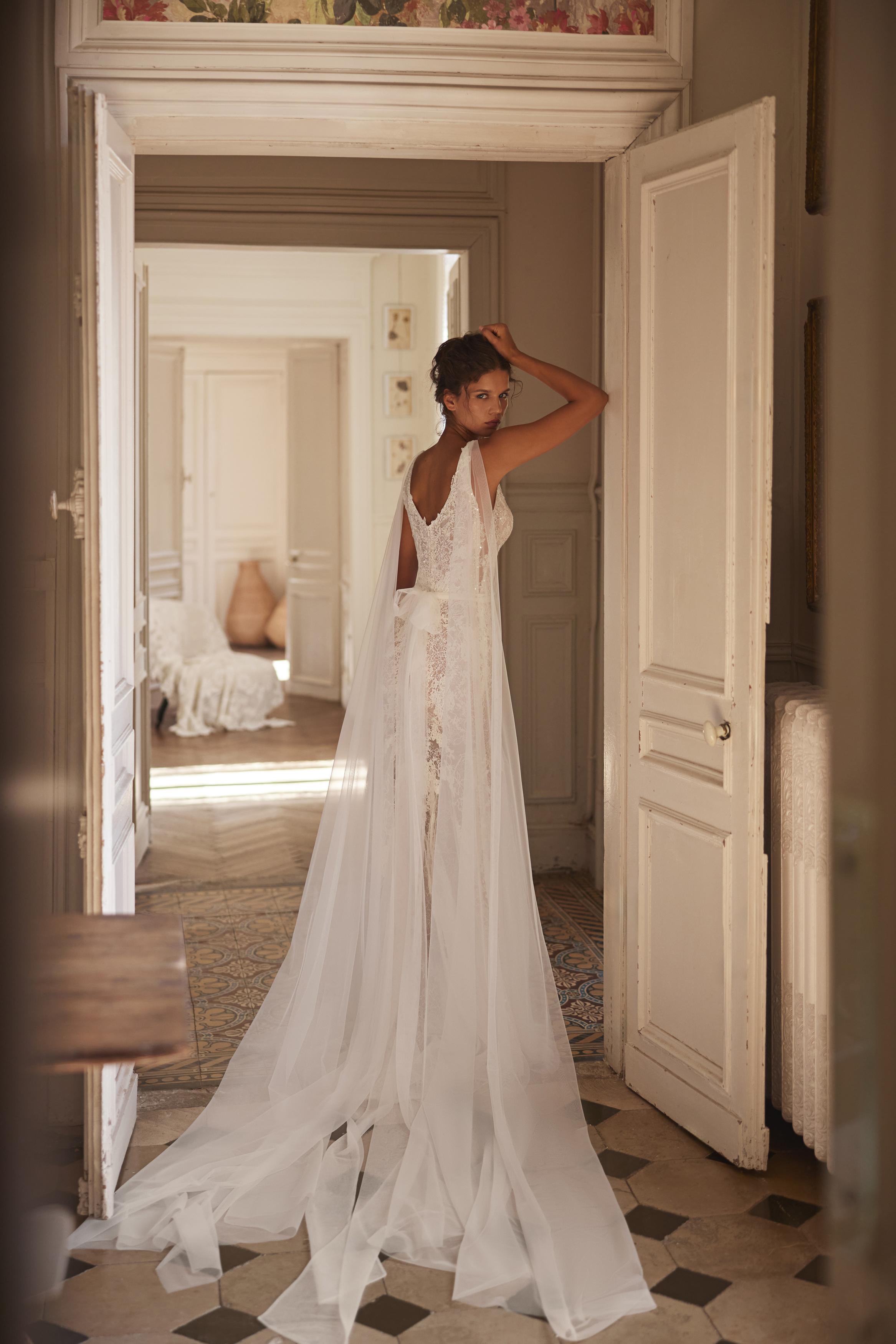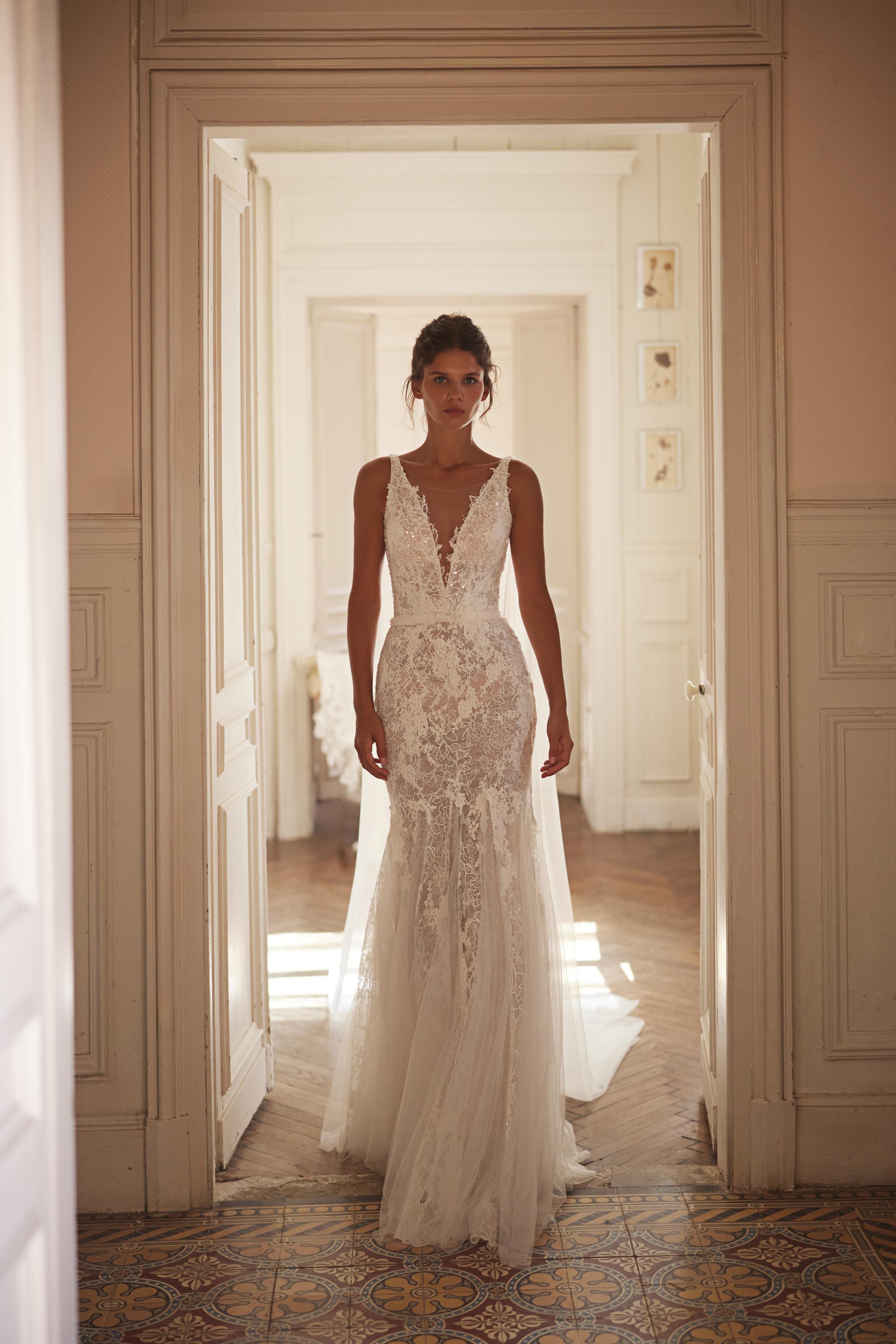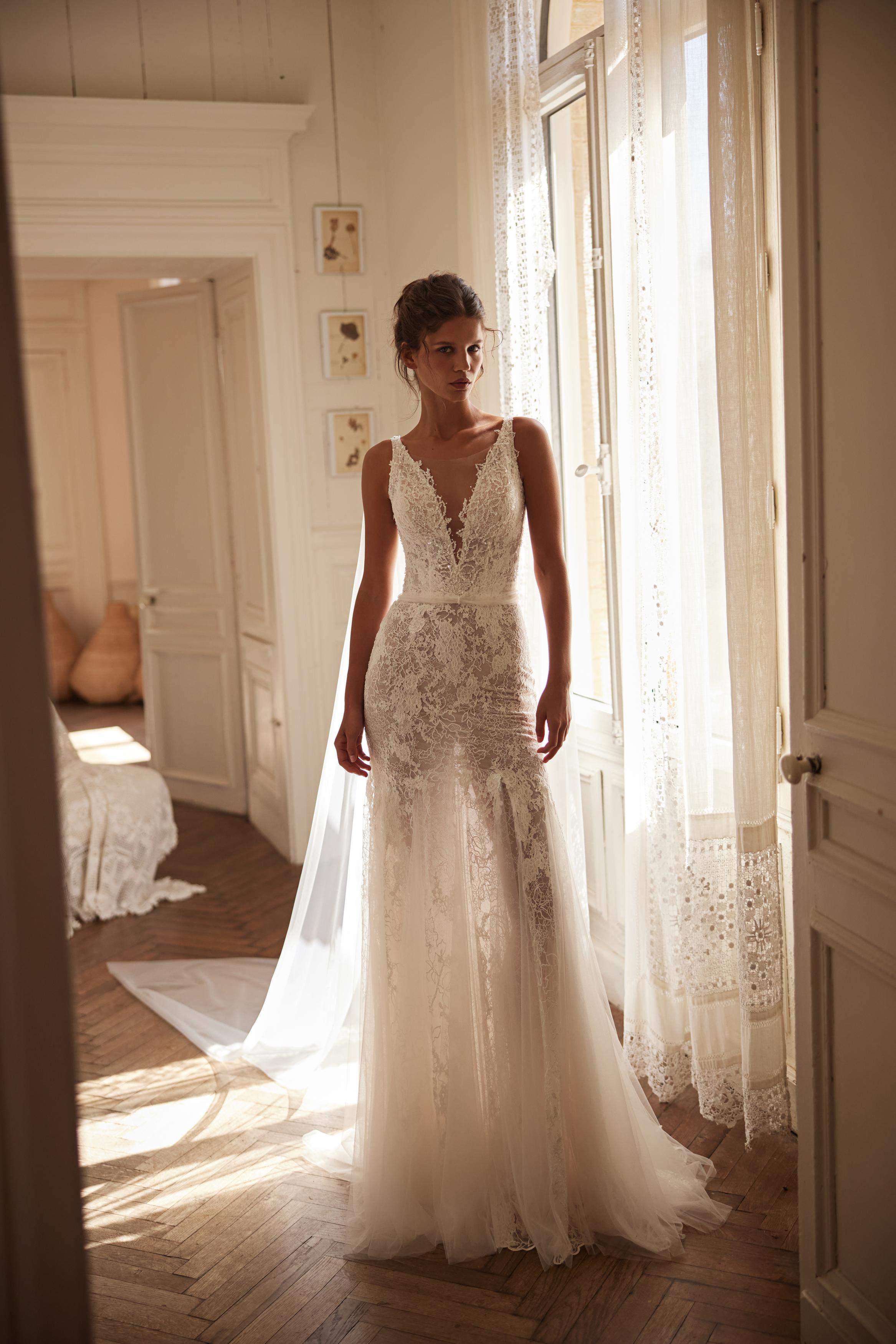 Este vestido de sirena color nude de ensueño está hecho de encaje Chantilly semitransparente con hilo bordado. El corpiño con escote profundo en V y tirantes está decorado con cristales, lentejuelas y cuentas. La cintura está destacada con un cinturón de tul con un lazo. La falda semitransparente y juguetona se complementa con inserciones de tul.