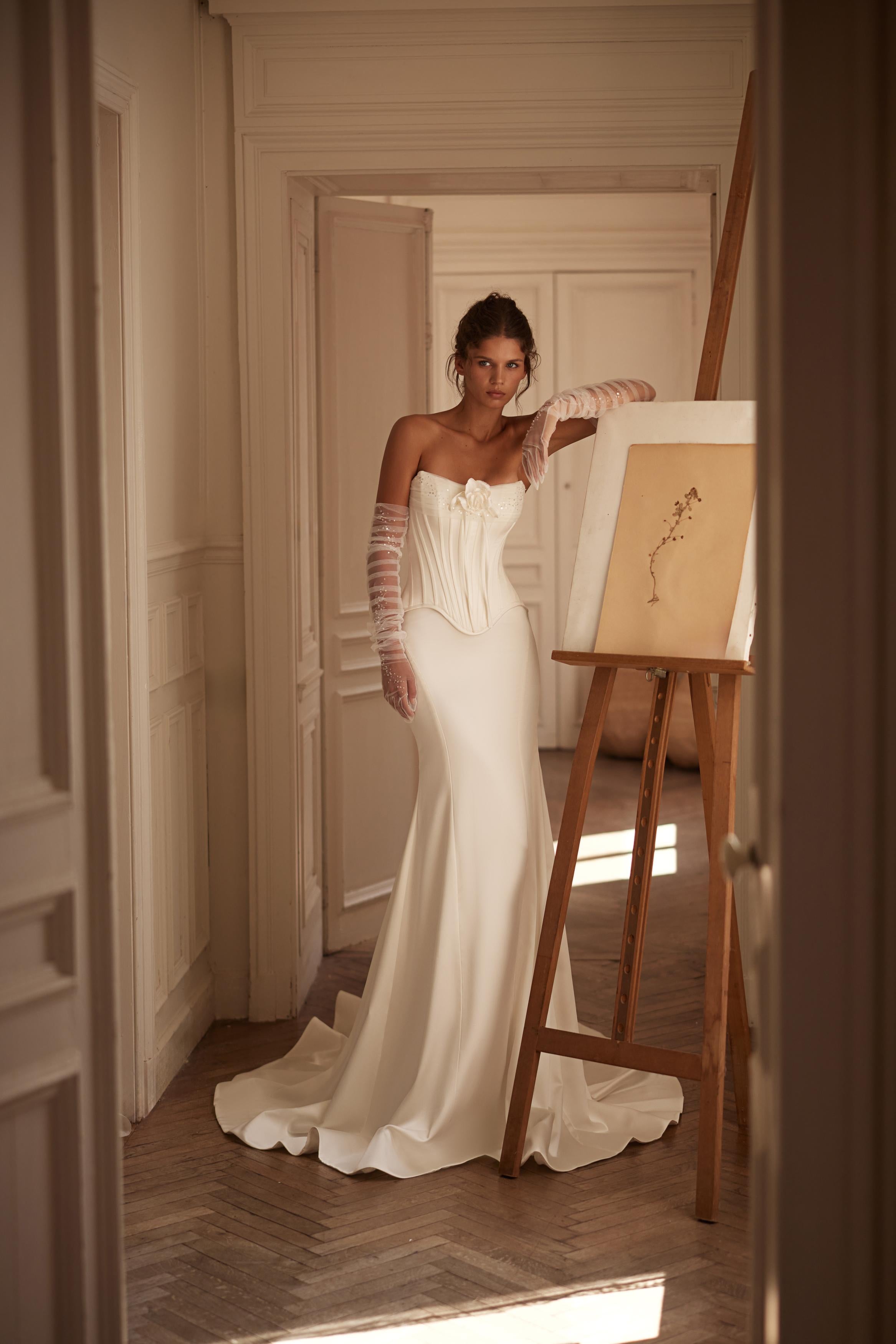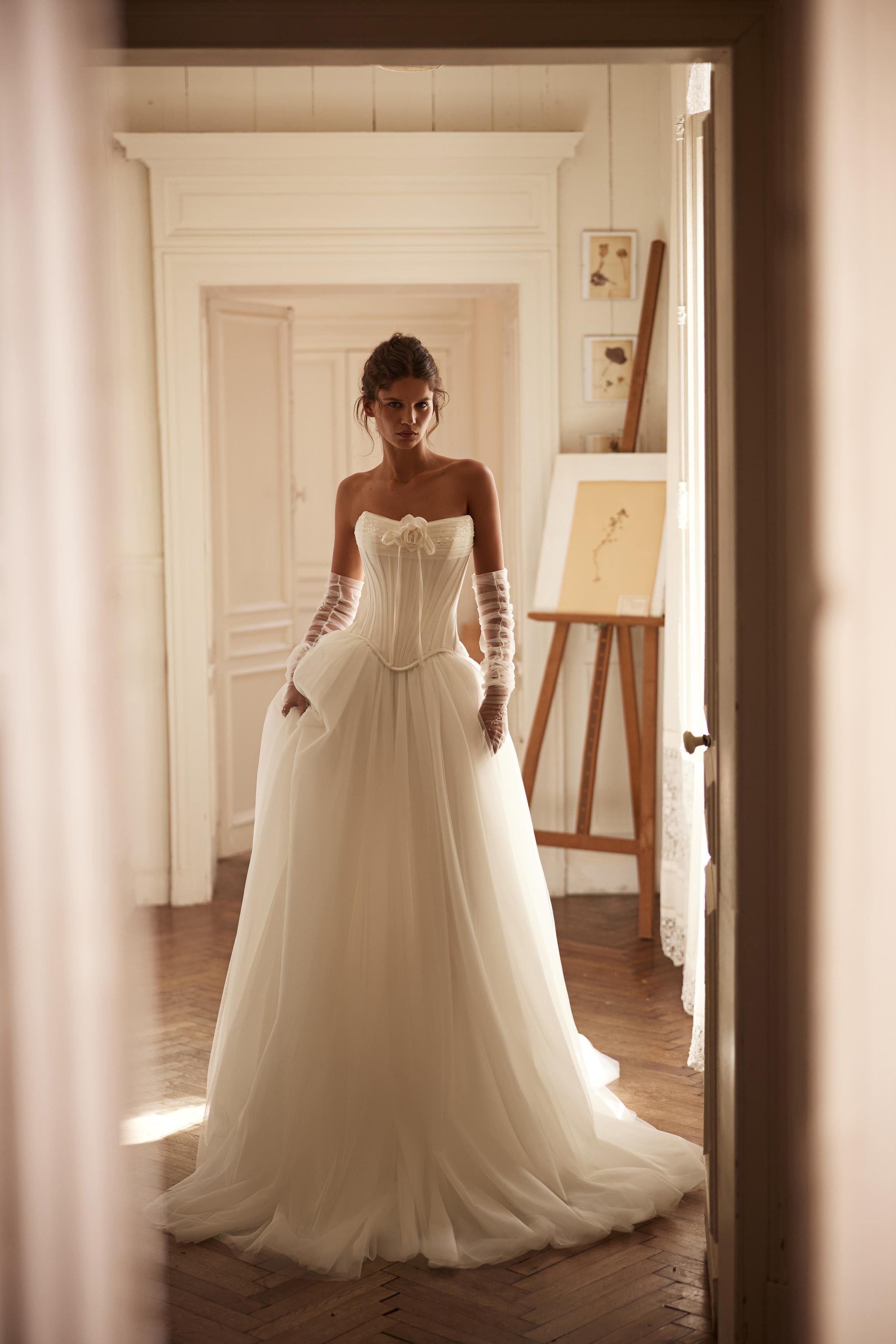 El look puede complementarse con una larga cola desmontable de satén, guantes elegantes drapeados con brillos, o una falda voluminosa desmontable de tul.