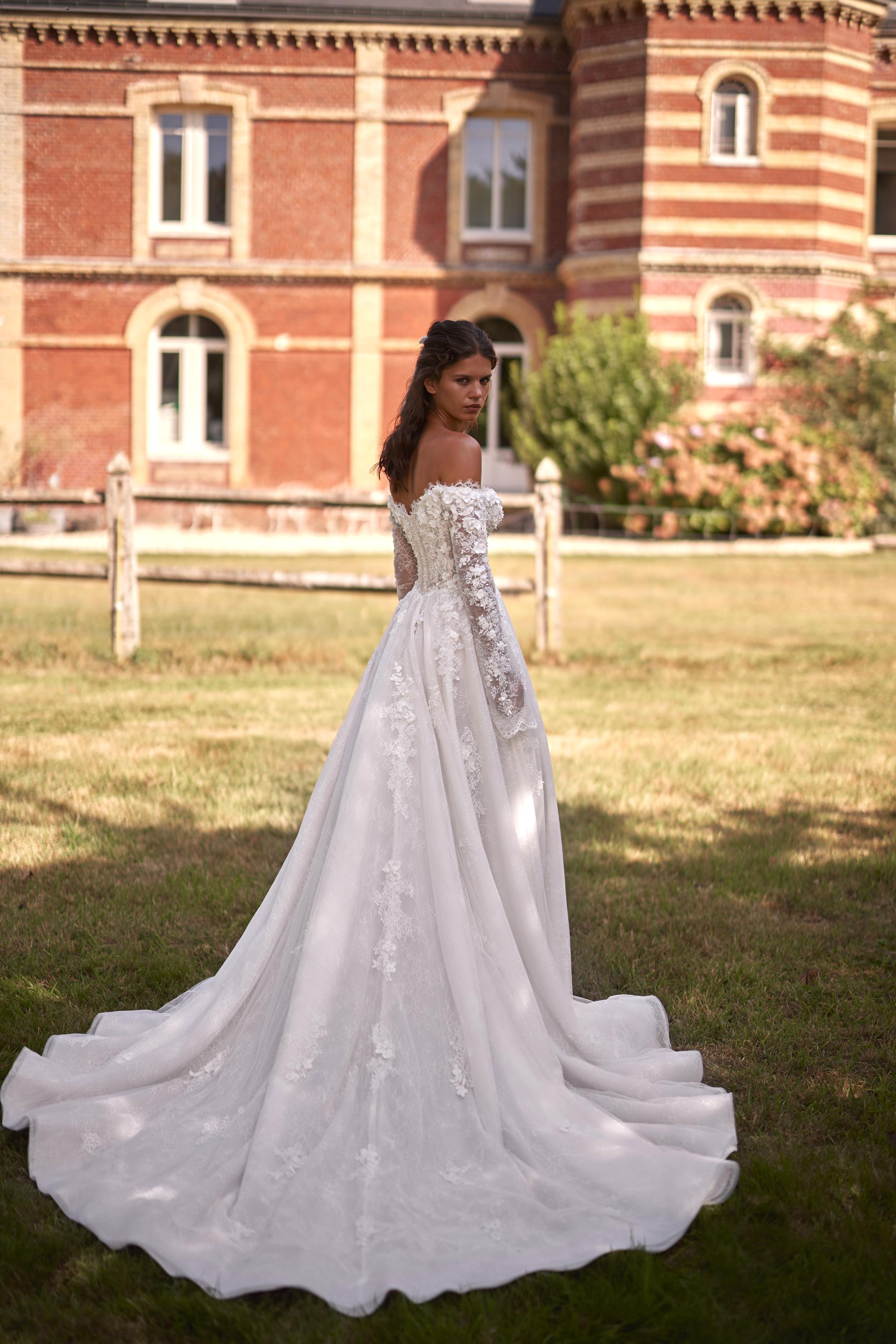 Un romántico vestido en línea A está hecho de delicado encaje Chantilly color nude. El corpiño con copas moldeadas y escote corazón tiene mangas largas con hombro descubierto. Cierra con una cremallera y cordón interno en la parte posterior del vestido. El corpiño está decorado manualmente con encaje, flores tridimensionales, lentejuelas, perlas y cristales.